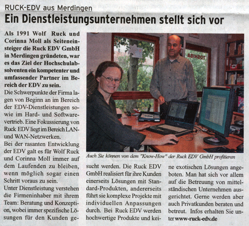 Die Ruck EDV GmbH wurde 1991 zunächst als reines Dienstleistungsunternehmen mit Firmensitz in Merdingen nahe Freiburg i.Br. gegründet. Ziel unserer Firma ist es, für Unternehmen ein kompetenter und umfassender Partner im Bereich der EDV zu sein. Unser Spektrum umfasst die Bereiche EDV Dienstleistung, Hardware- und Softwarevertrieb. Eine Fokussierung unserer Firma liegt im Bereich LAN- und WAN- Netzwerke, speziell auch in heterogenen Umgebungen. Besondere Erfahrungen liegen uns bei der Einführung und Implementierung von Active Directory, Microsoft Exchange, Dokumenten Management Systemen und Datenbankanwendungen vor. Wir realisieren für unsere Kunden einerseits Lösungen mit Standard-Produkten, andererseits führen wir komplexe Projekte mit individuellen Anpassungen durch. Dienstleistungen Um bei der rasanten Entwicklung der EDV auf dem Laufenden zu